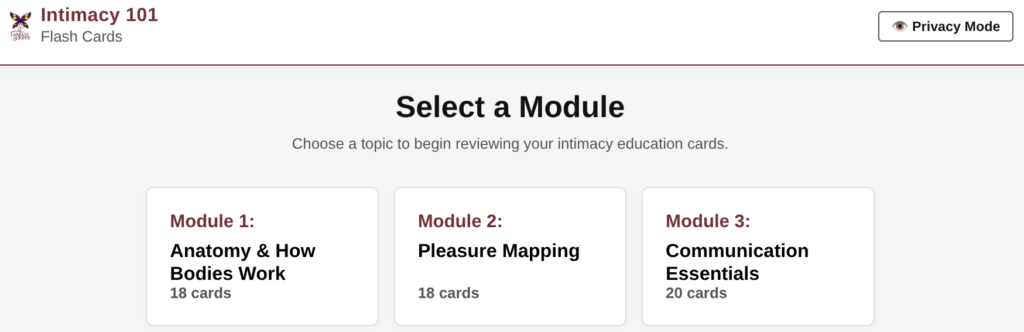 The Intimacy 101 Interactive Flash Cards are a free digital companion to the six-module series, designed to turn passive viewing into active learning. No app download. No account. Open on your phone and go.